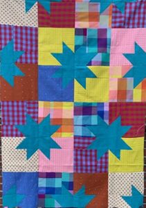 This fun patchwork quilt is a good beginner quilt pattern but also fun for any quilter. Grab 9 fat quarters or 9 quarter yards plus a fabric for your star and you will be on your way to a cute cozy quilt. You will be guided in class to have successful cutting with the rotary cutter, piecing using an accurate 1/4" seam allowance and finishing the quilt with straight line quilting and binding. The Star Pop ll Pattern by Quilty…