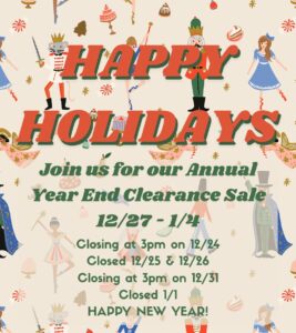 JOIN US FOR OUR ANNUAL YEAR END CLEARANCE SALE, SATURDAY 12/27 – SUNDAY 1/4